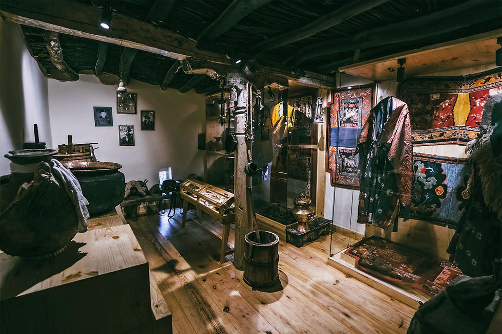 At Olmochey Heritage, we proudly host a small yet carefully curated museum that offers a window into the deep and vibrant history of Ladakh. The collection features rare and authentic artifacts belonging to the Olmochey family, the village of Stok, and the broader Ladakhi heritage spanning over 400 years. Among the treasured items on display are an old Ladakhi king’s cap, intricately crafted horse saddles, traditional grain mills, royal dresses, and a variety of household tools and heirlooms that reflect the lifestyle of past generations. The museum is open exclusively to our guests, offering them a rare and enriching experience of Ladakh’s royal and cultural legacy.